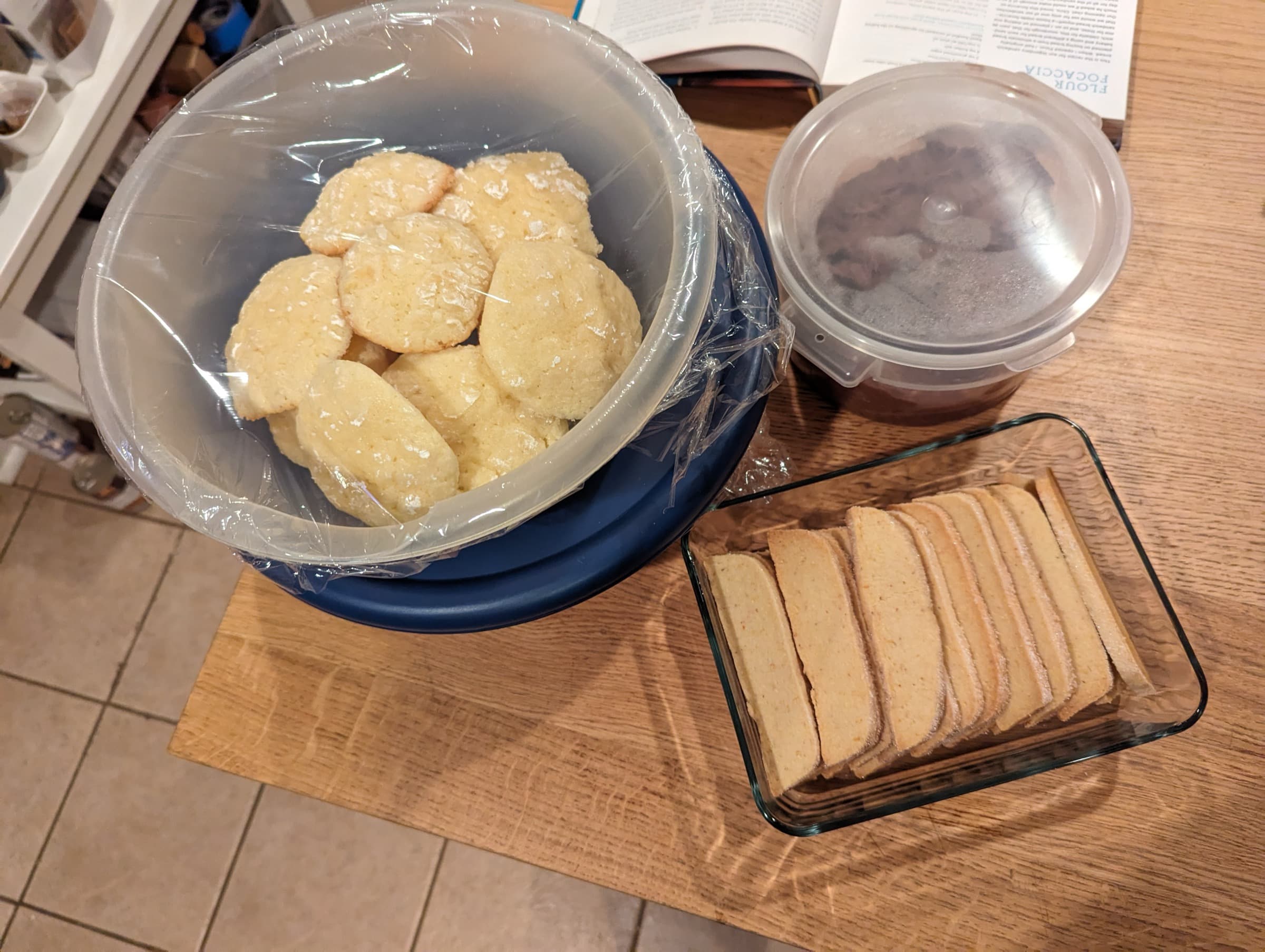 I also decided to do a marathon of cookie baking for Christmas. We were seeing my family & Mel’s for Christmas, so I needed cookies for everyone. Over three days, I made 230 cookies — double chocolate rye & lemon polenta from Pastry Love, peanut butter from Dessert Person (just the cookie, not filled), a soft lemon cookie (from some website I’ve forgotten), and a shortbread I flavored with almond and dipped in chocolate.